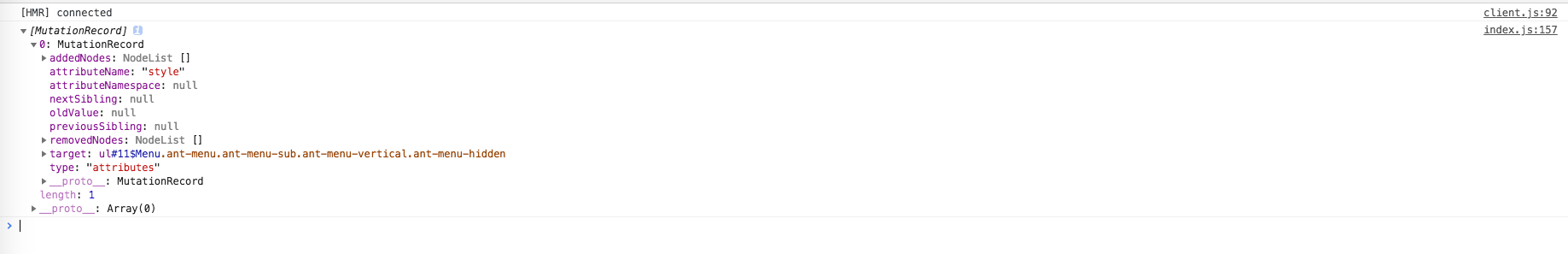 上面这段代码就是说,在 item_2$Menu 的 style 属性发生变化的时候,打印下 mutationsList 。于是在我将鼠标移入菜单的时候,打印了以下内容: