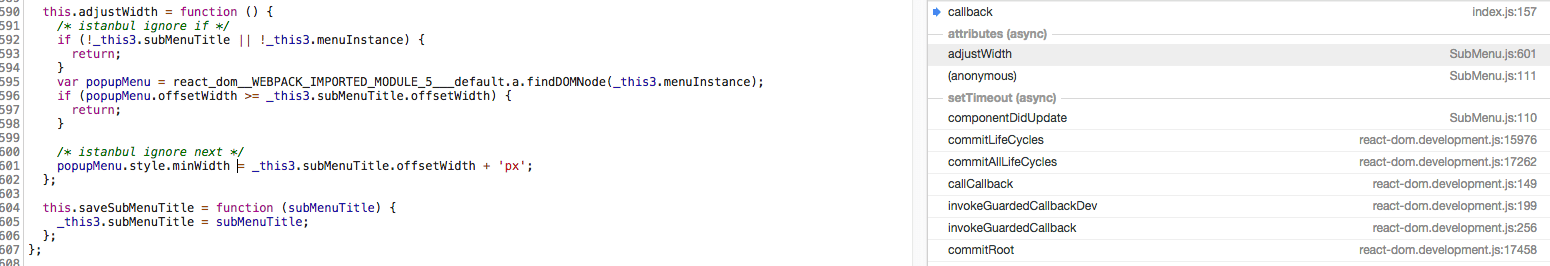 看来就是这段代码导致的。在浏览器中查看不方便,都是编译之后的代码,转战 Vscode ,查看我们的node_modules目录,先找到这个文件 node-modules/rc-menu/es/SubMenu.js 的 adjustWidth 方法: