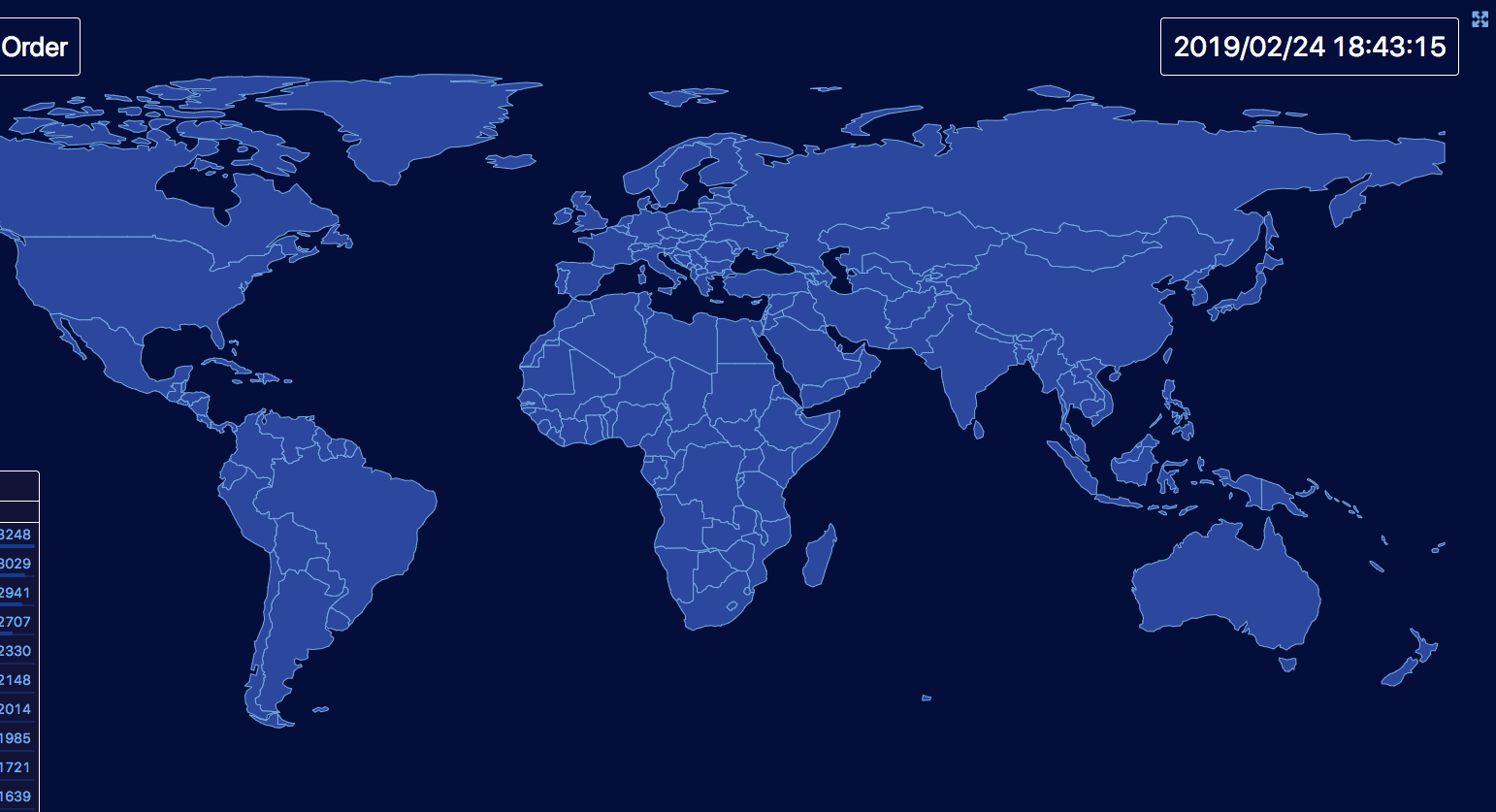 该地图展示实时的订单数据,当某城市产生订单时就会在该城市的位置产生动画。实时展示数据其实是每一分钟拉取接口数据然后做动画。