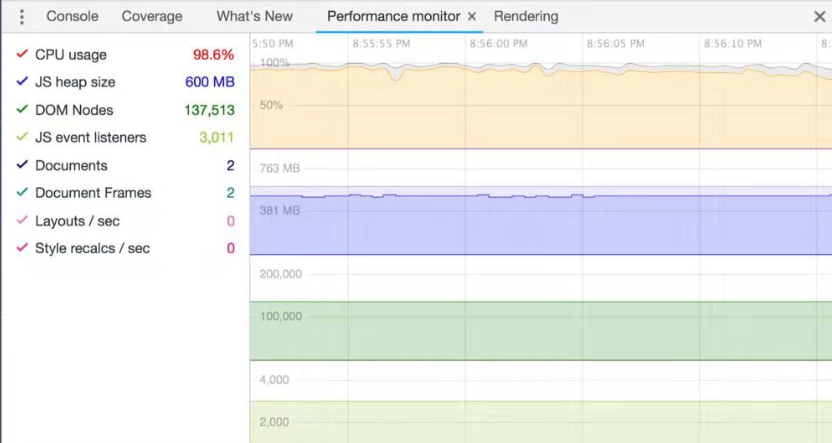 DOM Nodes 为 137513, CPU使用率为 98.6%,领导告诉我页面有内存泄露,要处理一下。