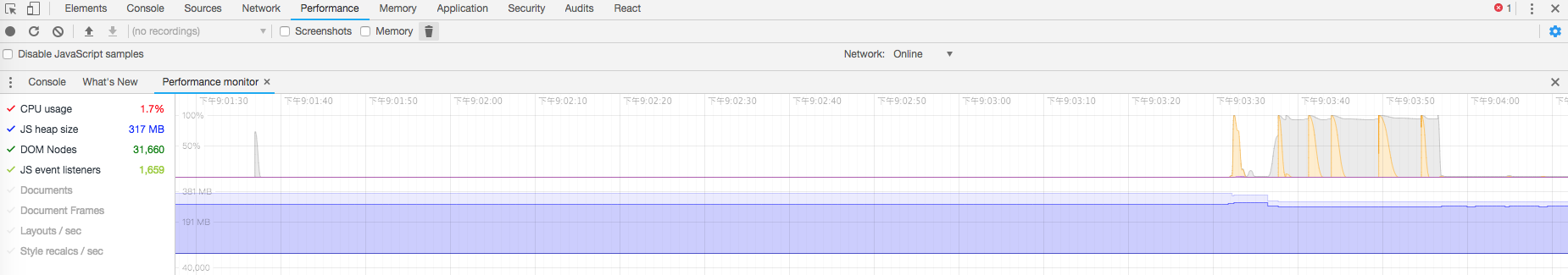 后来发现,即使我把实时地图页面移除,依然会在点击菜单来回切换各个页面的时候增加 dom nodes的数量,并且不会减少 (不会减少是关键,后面会提到)。于是按照 chrome 推荐的方法进行 抓取快照, 分析,发现并不能找出问题...,可能是我的使用方式不对(再吐槽下那 React的性能优化涉及到DevTools Timeline 分析,我也没用成功...),但是就是没帮助我排查出问题。然后我把这情况告诉同事请求帮助了。