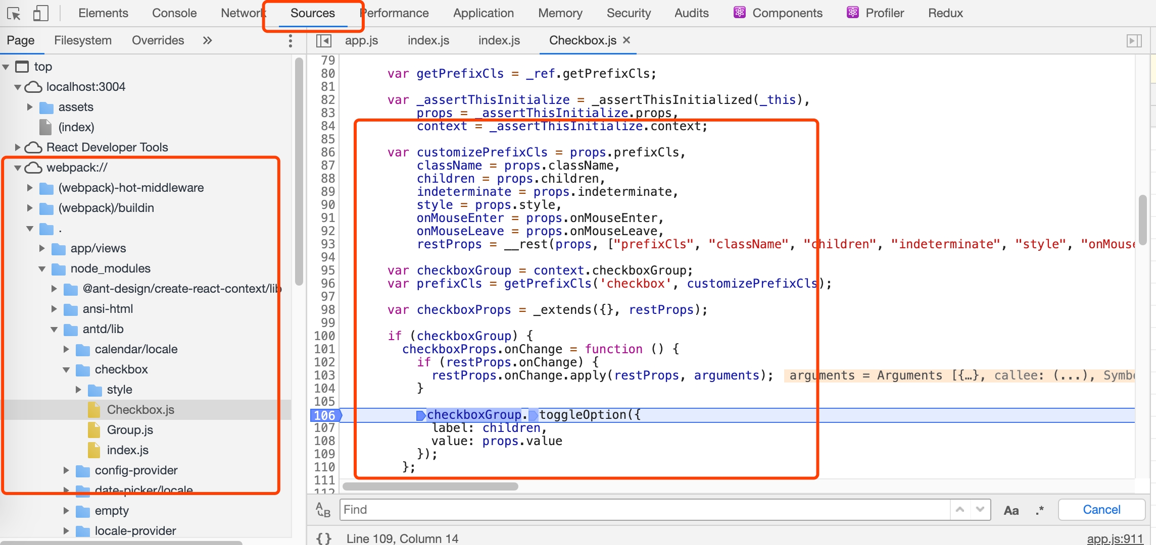 antd 默认使用的打包版本是 antd/lib 中的代码,我们在其中打断点,调试 antd 的代码。