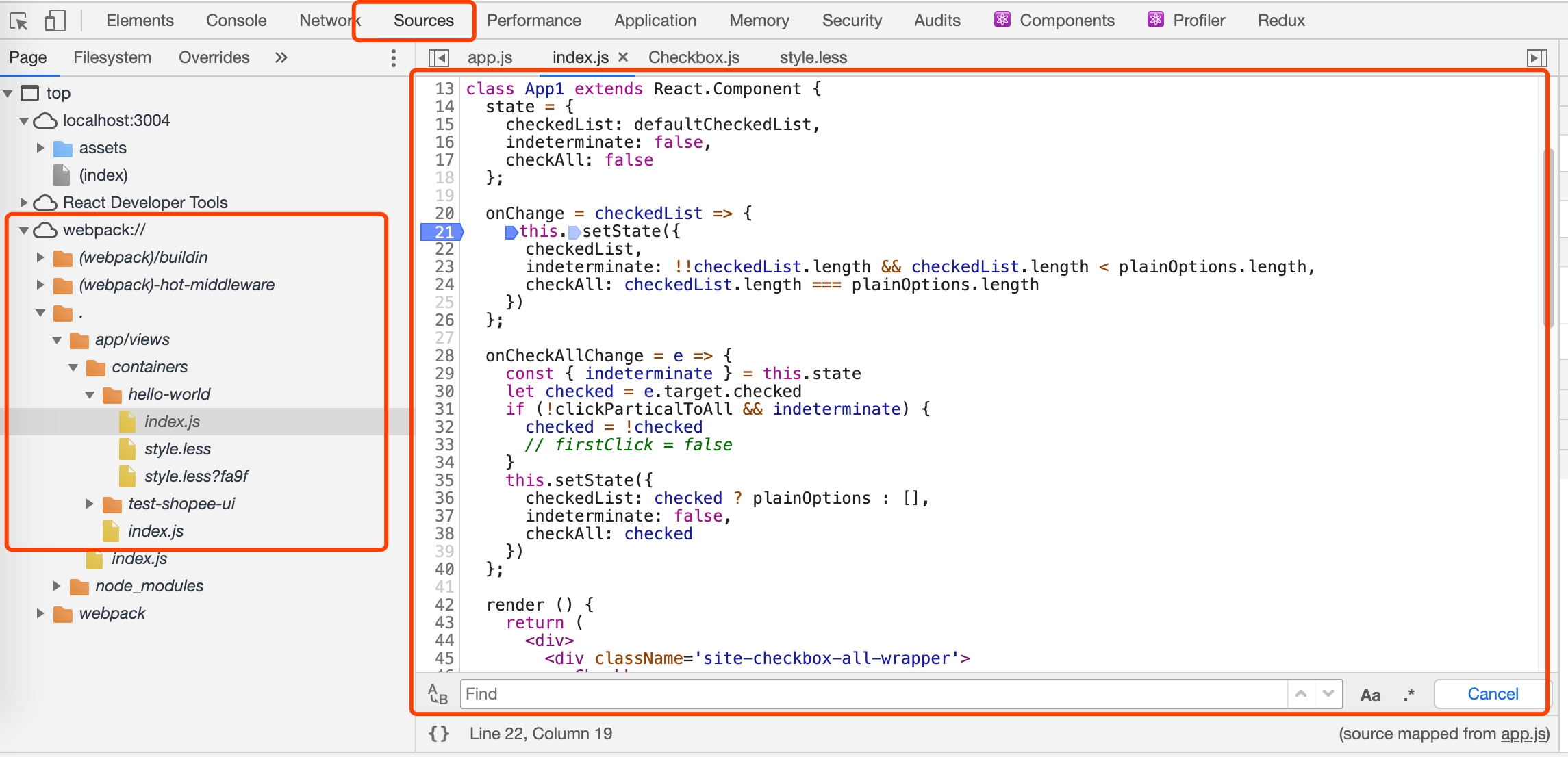 在 express-react-boilerplate 中,一开始是没有 source map 的, 这导致的结果是, 开发环境下 chrome source 中看到的代码如下: