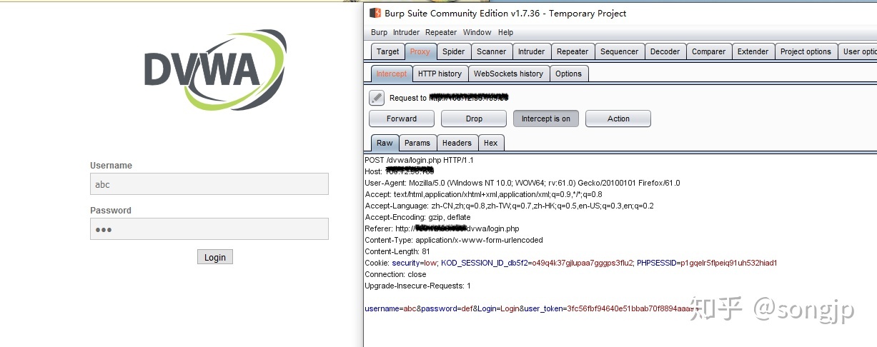 安装Burp Suite(以下简称BS),设置代理,使得 BS 能够拦截浏览器请求,捕获登录的数据包。