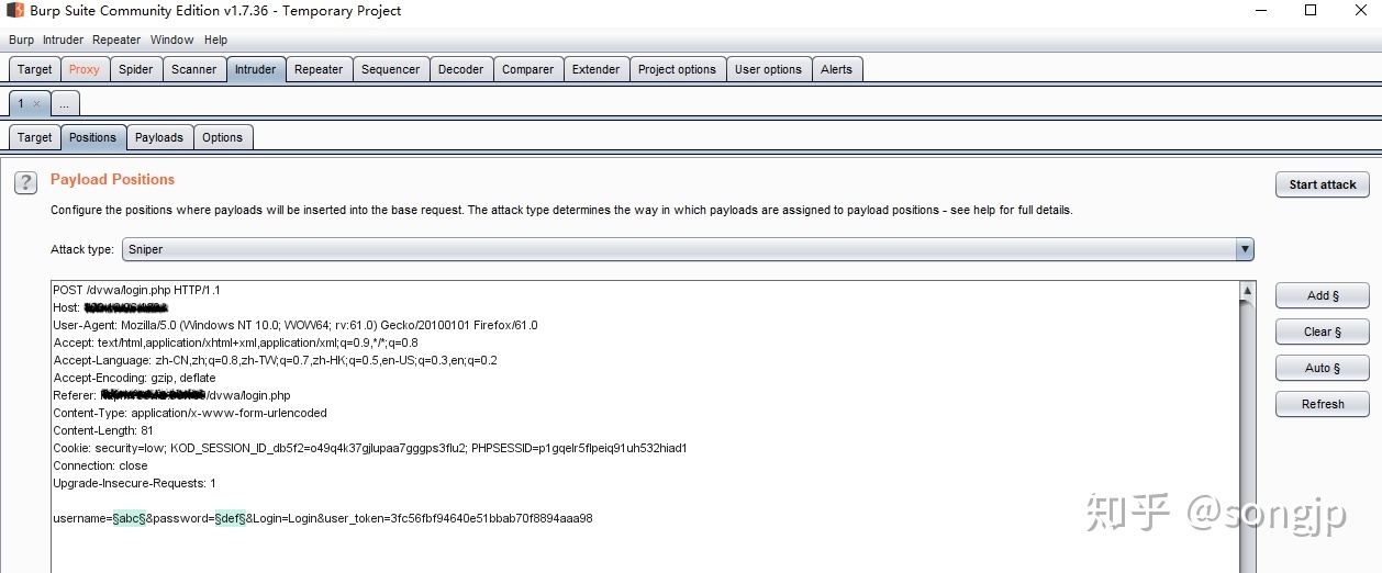 复制Raw数据包到 Intruder 页面,设置数据包中的账号和密码的占位(Add $),在 Payloads 中加载本地字典,Attack type选择Cluster bomb,这样每次请求就会从字典中依次加载字符串作为账号和密码去请求。如下图: