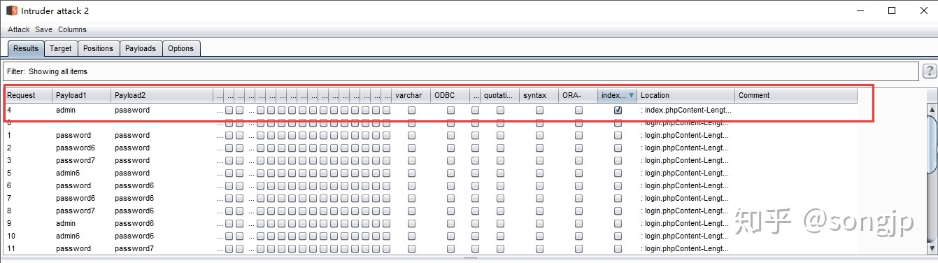 开始攻击之前设置 Option ,便于我们快速找出登录成功的账号密码。经过分析,A网站登录无论正确错误都会返回302状态码,区别在于正确时返回头Location字段为 index.php,错误时为 login.php。