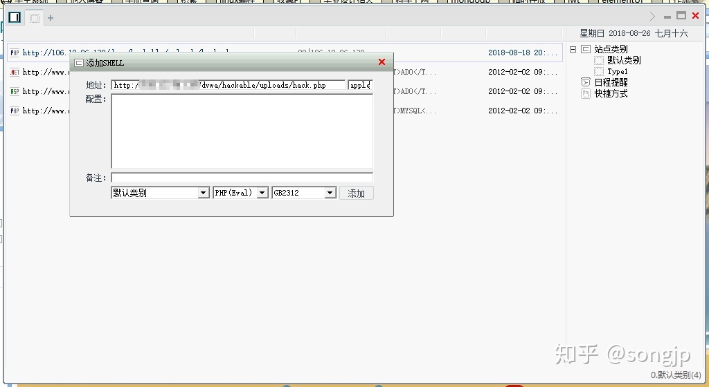 右键添加SHELL,填写 A.com/uploads/hack.php 及 apple 字符串(与hack.php保持一致),点击添加。如下图: